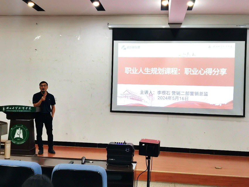 2024年5月16日下午,在广东金圻睿生物技术有限责任公司宣讲会上,公司营销总监李根石围绕同学们感兴趣的生物类专业的职业技能提升和职业前景规划,带来了一场生动的分享互动。