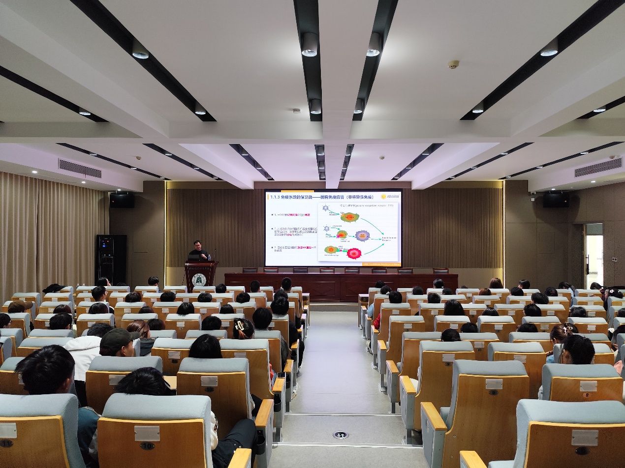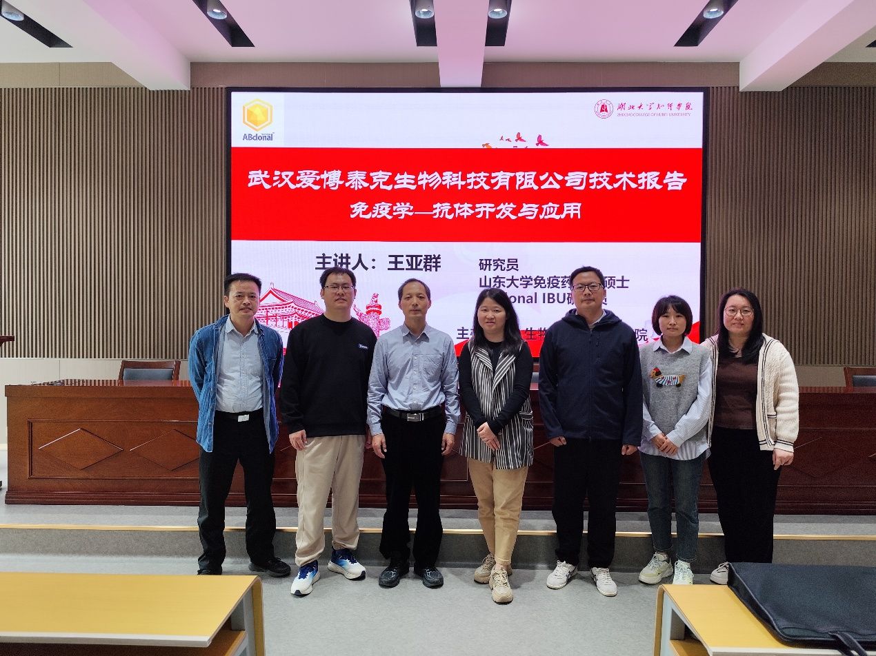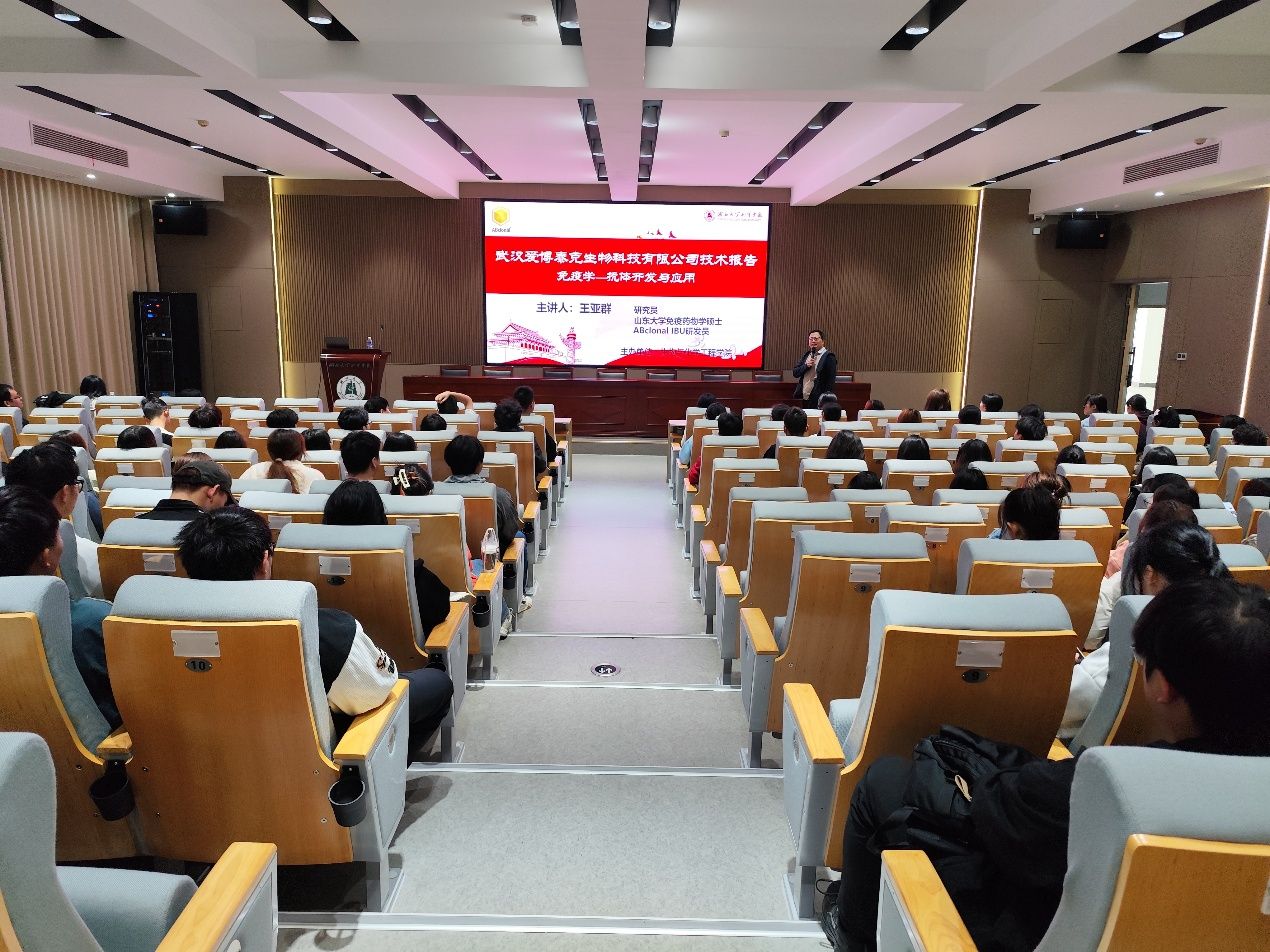 会上,王亚群先生首先进行了简单的自我介绍,接着,他全面详细的介绍了公司,武汉爱博泰克生物技术有限公司(ABclonal)是一家研发、生产和销售抗体的生物技术公司。现已开发10000多种Golden 抗体产品,涵盖表观遗传学、细胞自噬、信号通路、肿瘤疾病等特色领域。最后,他深入浅出的以“免疫学——抗体开发与应用”为主题,从“免疫学基础:抗原与抗体”、“抗原设计与抗体开发”、“抗体验证与应用”三个方面使同学们对抗原设计基本流程、抗体产品开发基本流程、抗体产品验证等职业相关知识有了基本的了解。