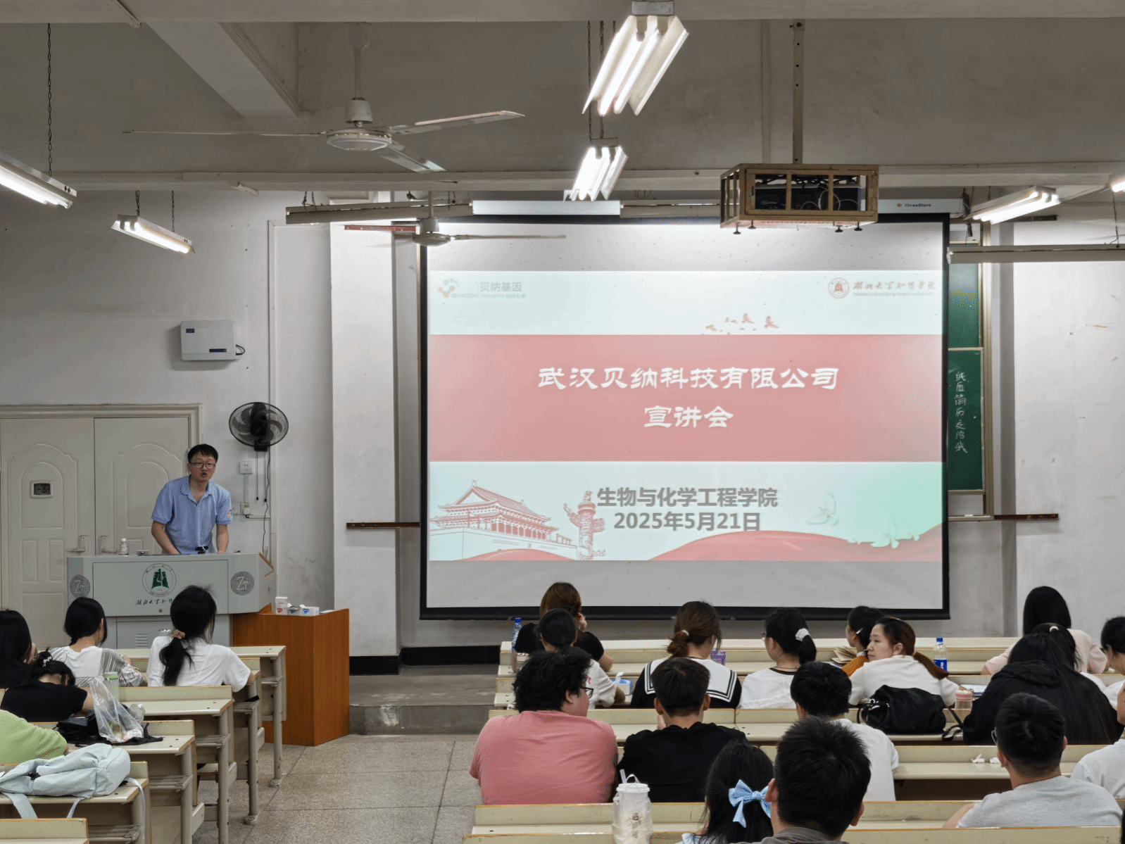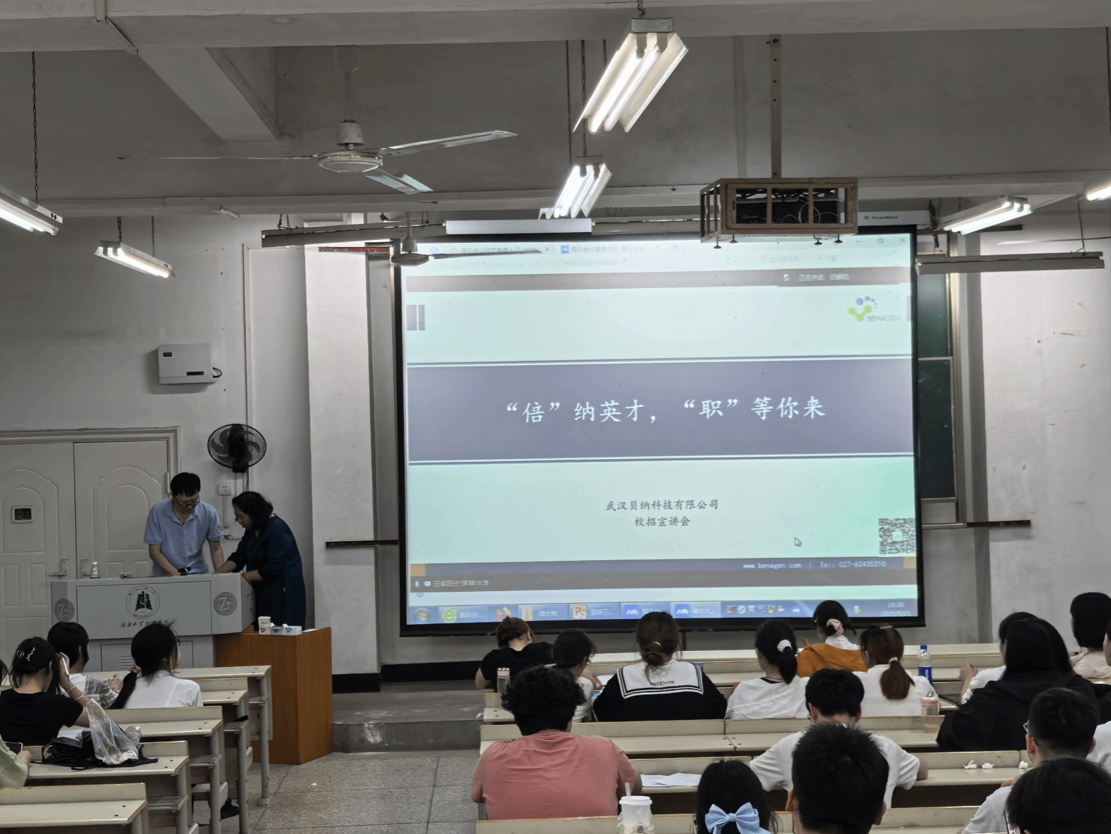 为加强校企合作,为毕业生进一步拓宽就业渠道,2025年5月21日,生化学院邀请武汉贝纳技术有限公司为22级学生召开了专场招聘宣讲会,到场参加的有生物技术教研室主任檀星老师、辅导员王晶老师以及22级学生。