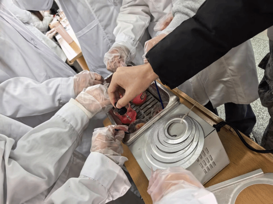 活动现场氛围轻松而欢快,参与者围坐交流,就原料特性等内容展开探讨。“日常使用口红较多,但亲手制作尚属首次,见证色粉在溶液中逐渐融合成目标色泽,内心充满成就感。”社员苗同学在操作过程中表示。现场弥漫着天然植物油的清香,与有序的交流声共同营造出积极向上的活动氛围。活动尾声,活力分子社社长和每位参与者一起拍了大合照,全体人员手持自制口红合影留念,为本次活动画上圆满句号。