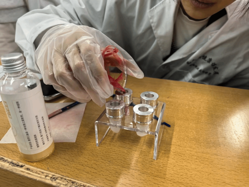 在邹学姐的分步指导下,参与者有序开展创作:首先每个小组派一个人来称量两克色粉,;随后严格按照配比混合蜂蜡与橄榄油并进行恒温加热,待原料完全融化后加入色粉搅拌至色泽均匀;最后将调配完成的口红液精准注入模具,放入冰箱冷却成型。