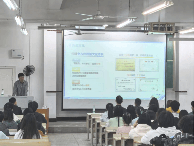 南京正大天晴制药有限公司专家团队代表钟总结合企业二十余年发展历程,全面介绍了公司的发展格局、核心优势及行业影响力。作为由泰国正大集团、江苏省农垦集团于2001年投资创建的中国化药综合实力百强企业,公司已形成以药物研发及生产为主体,原料药平台、商业平台为两翼的全产业链格局,产品涵盖心脑血管、肿瘤、影像、外科围术等多个治疗领域,凭借“以仿制带动创新,以创新驱动未来”的研发理念,在行业内占据重要地位。专家重点分享了公司在药物研发、智能制造、质量控制等方面的前沿技术与实践经验,详解了核心产品的研发历程、技术突破及市场应用,介绍了公司数倍于行业平均水平的研发投入、数百人的专家级研发团队及博士后工作站的创新成果,让在场师生对医药行业的发展现状与技术趋势有了更直观的认识。