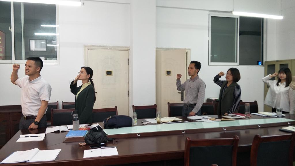 本网讯(通讯员 文斯)5月15日,生化学院教工党支部就学习“四有好老师”开展主题党日活动。学院总支书记刘克主持会议,学习内容涵盖师德师风建设、教育的根本任务与目的、好教师的四个标准等多个方面。我院教职工结合自身的工作情况,就上述内容展开了讨论,并对自己目前的工作进行了总结与反思。我院教职工纷纷表示,要将此次学习研讨的成果化为自觉行动,在武装头脑、指导工作、解决问题上下功夫,切实将“四有好老师”精神转化为共同的价值认同和行动自觉,真正内化于心,外化于行。活动最后,生化学院教工党支部在刘克书记的带领下重温入党誓词并缴纳党费。