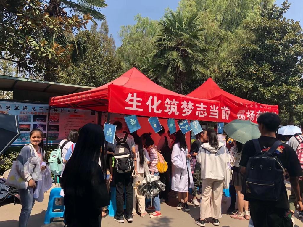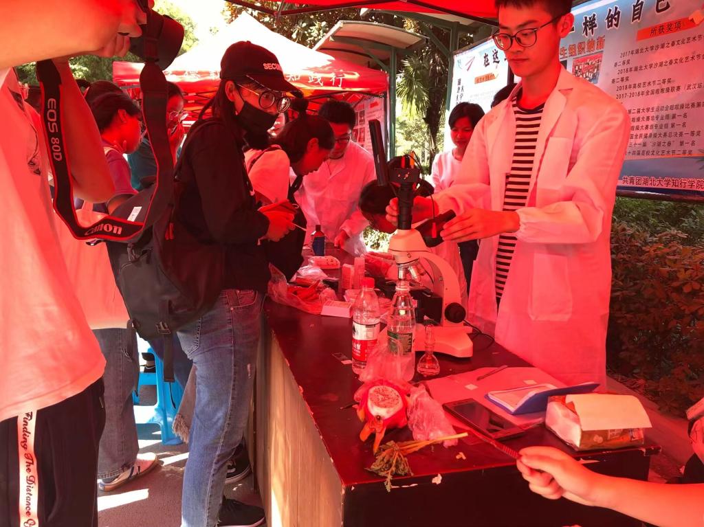 (本网讯 通讯员 郑丽凡)为庆祝新中国成立70周年,展现青年大学生热爱专业学习,务实进取的精神风貌,生化学院积极向校团委申报了“生化筑梦志当前,昂扬奋进新时代”的主题团日活动。在学院团委指导老师的组织安排下,专业课老师的支持配合下,学院分团委学生会认真落实了此次团日活动的具体筹备工作,并于9月27日在坤生园门口设置帐篷点进行项目成果展示。活动当日,学院负责组织的师生热情高涨,学生们对展出项目蓝晒植物摄影、显微观察视频以及血型检测都产生了浓厚的兴趣。在活动组织者的指导下,不少学生都兴致勃勃地运用蓝晒法现场制作自己喜欢的植物剪影,或者是伴随着负责人的生动讲解,利用电子显微镜观看切片里的微生物。其中,血型检测项目人气最高,一应俱全的常用医疗用品,细致专业的操作,以及身穿白大褂的身影,让我们生化学子显得格外有魅力,成功吸引了观众们的目光,都纷纷前来参与体验。