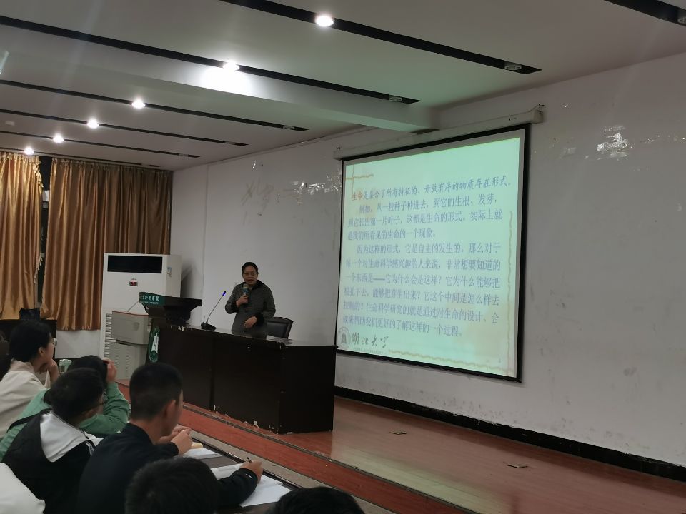(本网讯 通讯员黄砚殊)原清华大学的校长、华人生物学家施一公先生曾说:“我相信,21世纪是生命科学的世纪。”为提高我校生化学院全体新生的科研意识,培养科学严谨的科研态度,引导学生认识、体验生命,我院有幸邀请到了湖北大学生命科学系教授、华中科技大学现任教授顾问现杨艳燕,来为我们解读21世纪的新兴专业——生命科学。