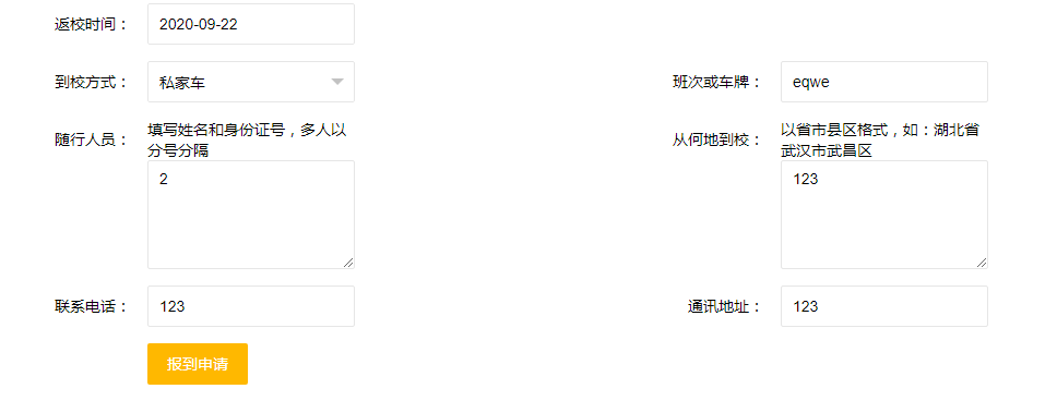 三、打开主界面左边的“新生入学”菜单,点击“报到申请”菜单,填写相关信息,如下图,并点击“报到申请”按钮即可完成申请任务。