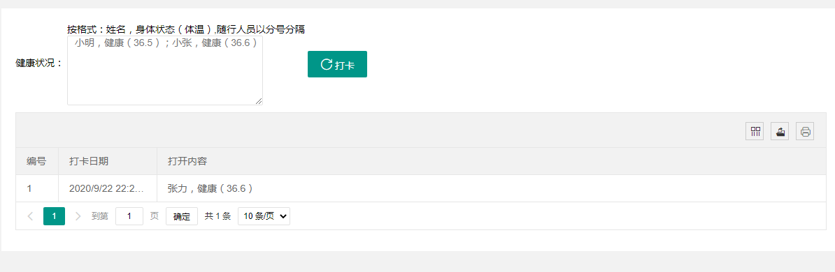 四、打开主界面左边的“健康打卡”,按照要求的格式填写健康信息,点击“打卡”按钮,即可完成当天的健康打卡任务,需要注意的是新生需要完成十四天健康打卡任务。