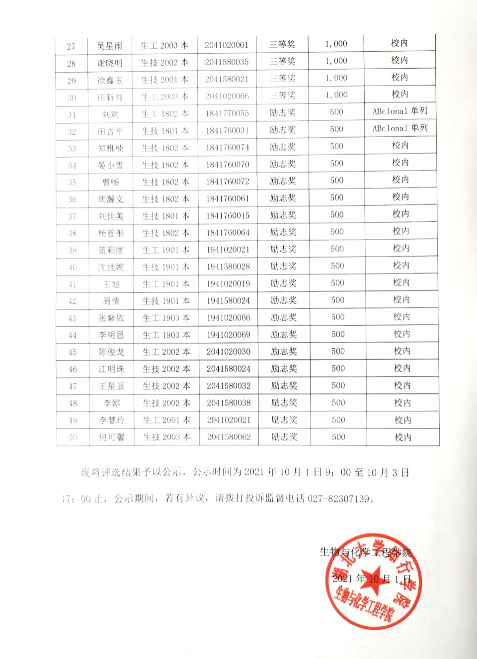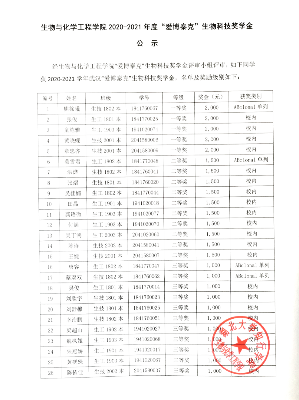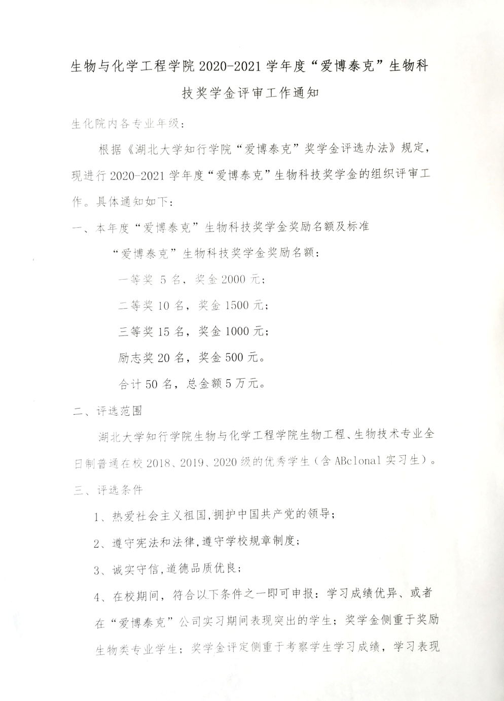 中国·yl6809永利集团2020-2021年度“爱博泰克”生物科技奖学金公示