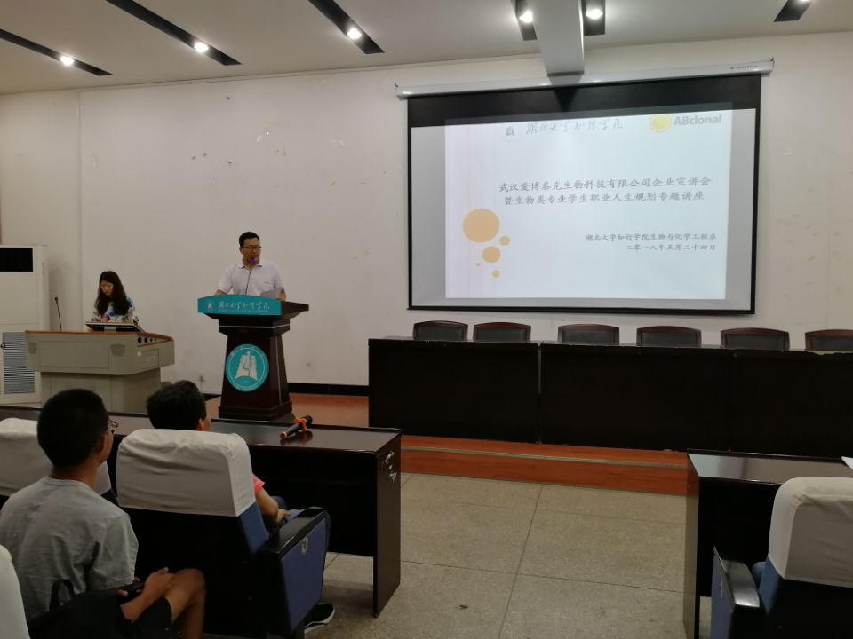 签约会后武汉爱博泰克生物技术有限公司刘媛经理面向生物工程和生物技术专业学生作了专业人才职业人生规划讲座和企业宣讲,并代表公司向我系学生发出诚挚邀请,邀请各位同学到武汉爱博泰克生物技术有限公司参观、实习和就业。