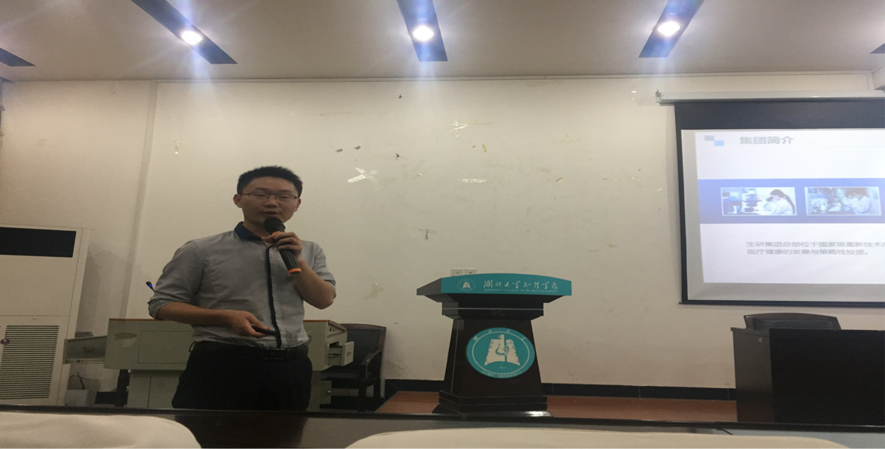 李主管首先就学校老师的邀请、老师、同学们的到来表示感谢,他讲到,生研生物集团是由五所公司组成,集团旗下现有武汉生之源有限公司、武汉华美生物工程有限公司、武汉金开瑞生物工程有限公司、武汉福来生物工程有限公司、武汉金利生医疗器械有限公司。李主管讲到,生研集团拥有一支由十几位留美专家、教授、学者组成的技术和管理团队,还与诺贝尔奖得主兰迪·谢克曼、哈特穆特·米歇尔等一系列学者有着长期稳定的合作。李主管表示,生研集团通过几十年的不断发展进步,已经发展到一家业务遍布全球90几个国家,具有一套完整的自主研发平台和一条较完整版上下游产业链,是一家湖北省优秀生物企业。李主管表示,生研集团不仅具有优秀的科研水平,还是一个有责任心的企业,组织慰问抗洪抗险将士、收购农民西瓜。李主管面对同学们的提问,细心、仔细地回答同学们的问题,并因此讲出自己在这些过程中的体会。他讲到,要想达到一定的高度,就必须牺牲一定的东西。态度是极其重要的,不管是在学校还是工作都要积极的对待人与事。