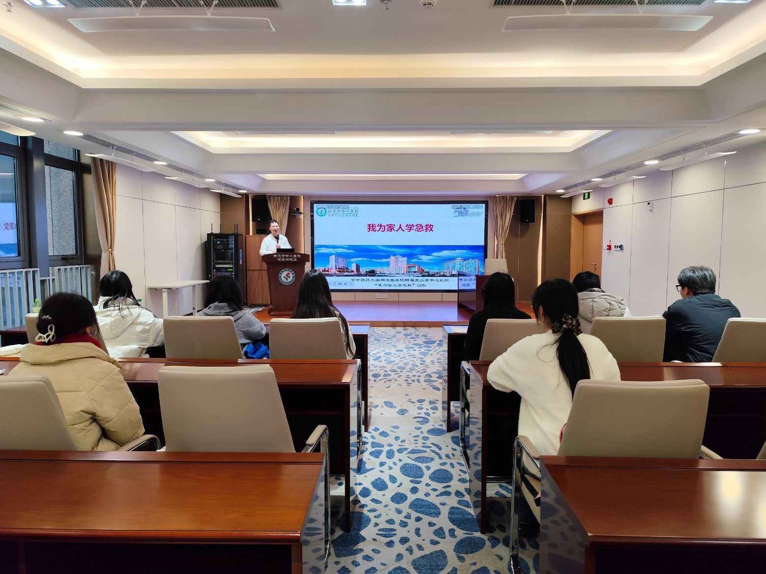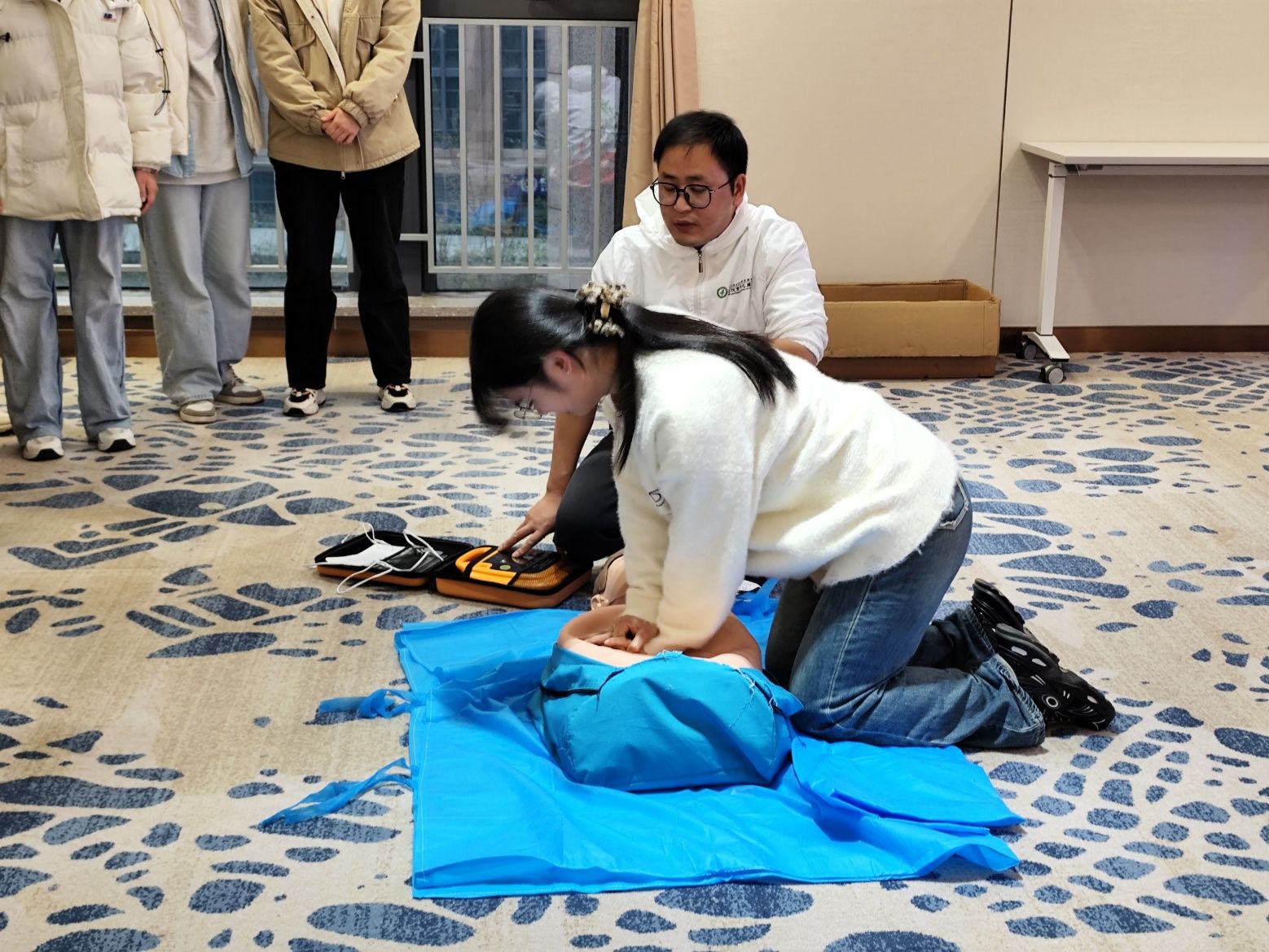 随后的急救知识培训环节同样精彩。以“我为家人学急救”为主题,培训旨在提升师生应急救援能力。培训老师通过鲜活案例、直观图片和详细讲解,深入剖析心肺复苏(CPR)及自动体外除颤器(AED)操作要点。现场演示环节,从判断患者意识到规范实施急救步骤,再到正确使用 AED,一气呵成,为师生呈现标准急救流程。同学们热情高涨,积极参与实操,在老师指导下认真练习,精准把握力度节奏,切实将理论转化为技能,为守护生命增添保障。
