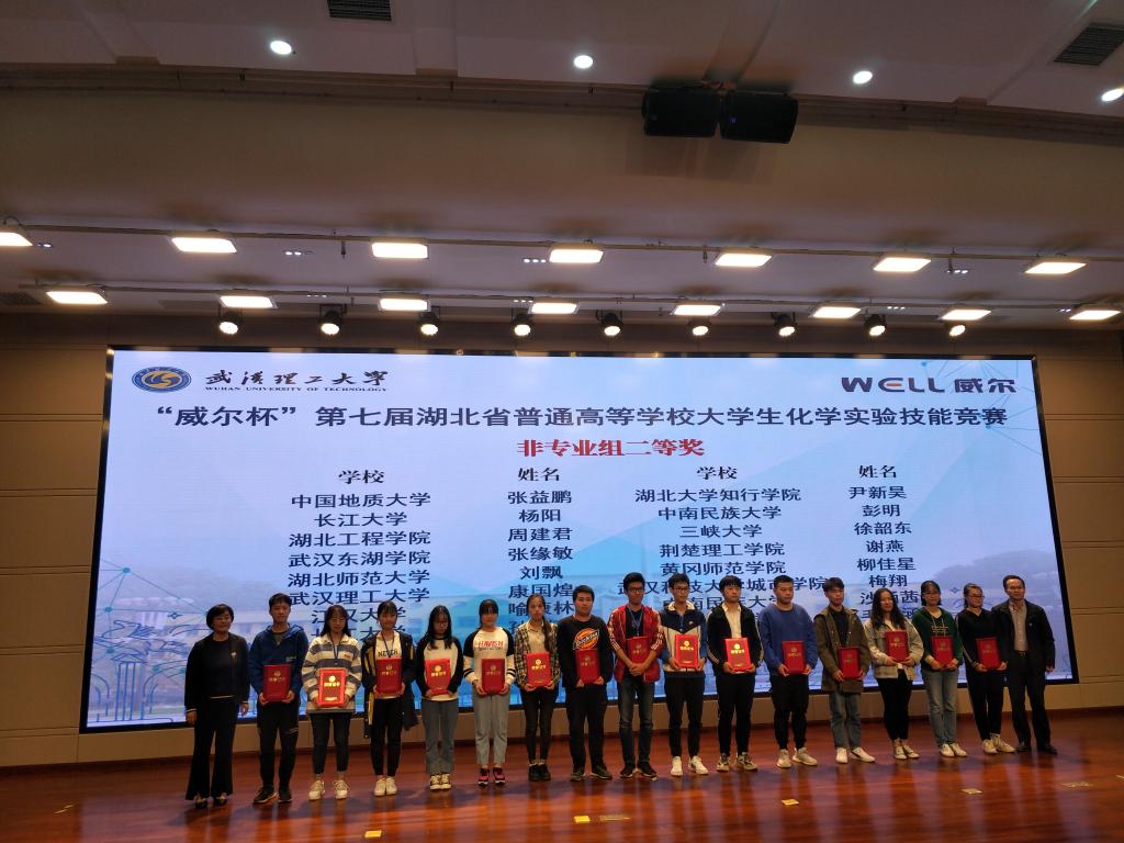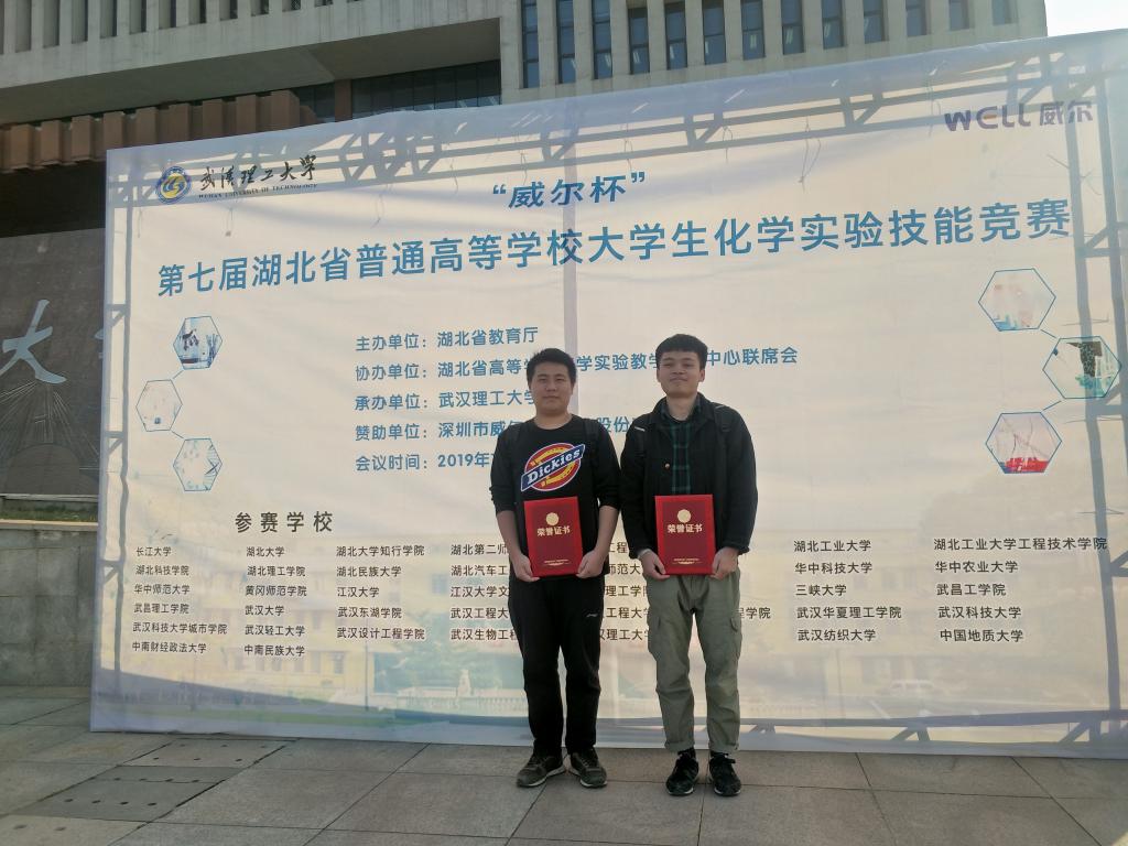 (本网讯 通讯员吴绍艳)2019年11月8日-10日,第七届湖北省普通高校大学生化学实验技能竞赛在武汉理工大学举行,该竞赛由湖北省教育厅主办、湖北省高等学校化学实验教学示范中心协办。来自武汉大学、华中科技大学、华中师范大学等全省37所高校的174名学生参加了本次竞赛。经过紧张激烈的比赛,我校中国·yl6809永利集团的参赛选手在与众多重点高校学生的同台竞技中获佳绩,其中,化学工程与工艺专业2016级尹新昊同学荣获化工制药类非专业组二等奖,化学工程与工艺专业2016级魏元流同学荣获化工制药类非专业组三等奖,应用化学专业2016级周顺和王彤瑶同学荣获化学类专业组优秀奖,吴绍艳、李琴、张丛兰、祝媛媛、盛希群、任晓聪等老师承担了本次竞赛的赛前指导工作。