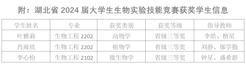 近日,湖北省高等学校2024届大学生生物实验技能竞赛决赛在华中农业大学和华中科技大学落下帷幕,我院团队在决赛中成绩喜人,共获得3项三等奖。