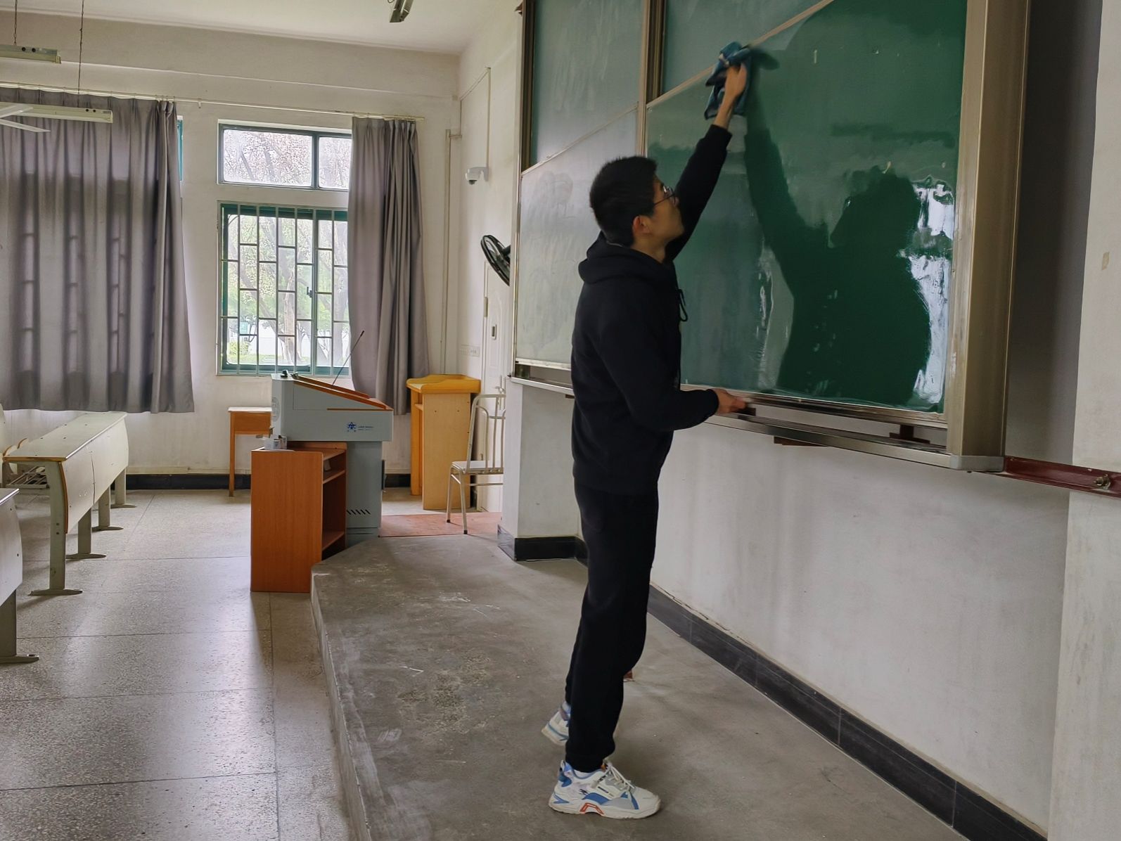 为营造整洁的学习环境,学院率先组织志愿者对第四教学楼开展了全方位的清洁行动。志愿者们分工精细,默契配合。有的同学手持抹布,专注地擦拭着桌椅,不放过任何一处积尘;有的同学弯腰清扫地面,角落中的纸屑、污渍被一一清理干净;还有同学认真擦拭黑板、窗台与电灯开关。在大家齐心协力的努力下,四教重新焕发出整洁的光彩,同学们在劳动中不仅提升了环保意识,更深刻领悟到集体荣誉感的真谛。
