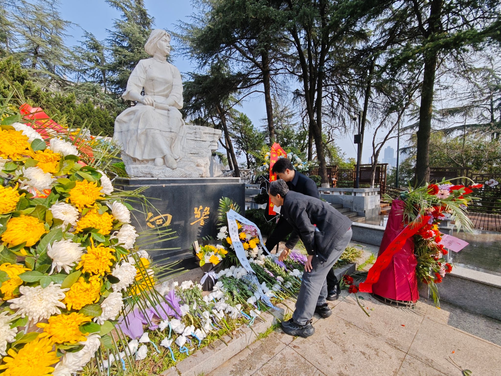 松柏凝翠,丰碑矗立,烈士陵园内庄严肃穆、氛围凝重。在向警予烈士雕像与墓冢前,全体党员教师身着正装、整齐列队,神情肃穆、垂首肃立,集体默哀,深切缅怀革命先烈的丰功伟绩,寄托对英烈的无限哀思与崇高敬意。